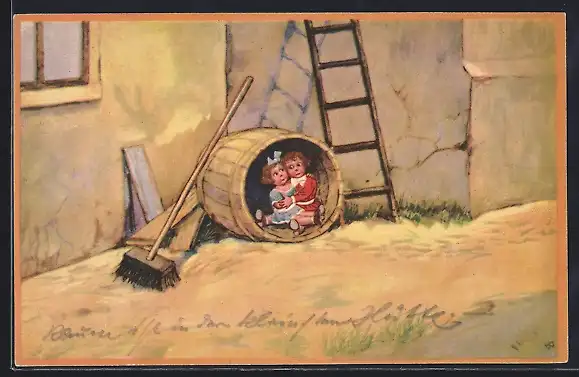 Künstler-AK Ängstliches kleines Paar versteckt sich in einem Fass