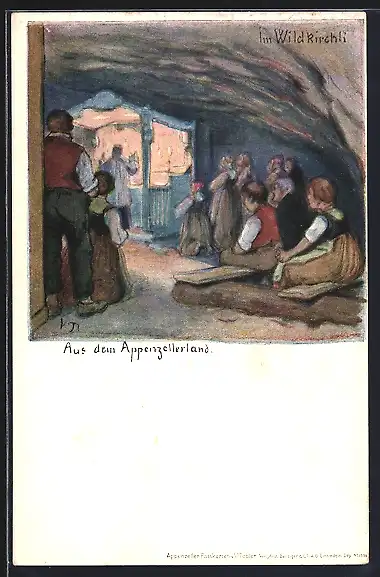 Künstler-AK Aescher / Wildkirchli, Menschen im Wildkirchli
