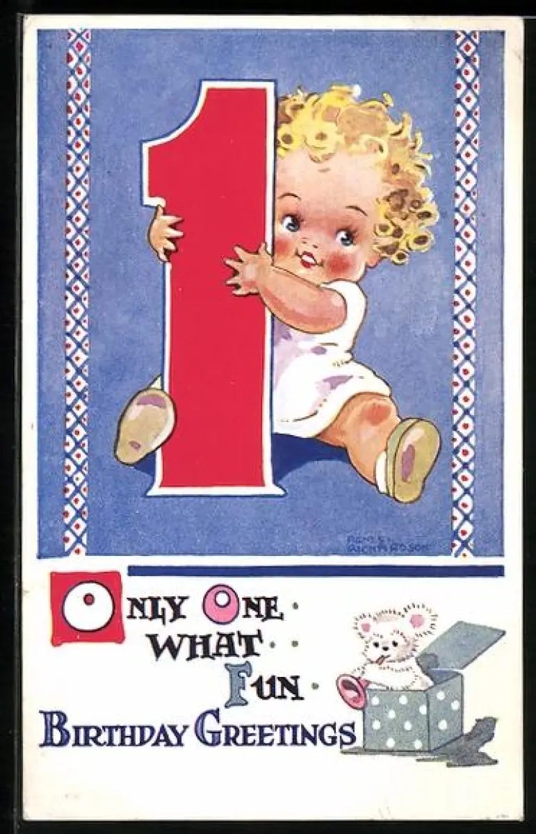 Künstler-AK Agnes Richardson: Glückwunsch zum 1. Geburtstag, Baby mit grosser 1