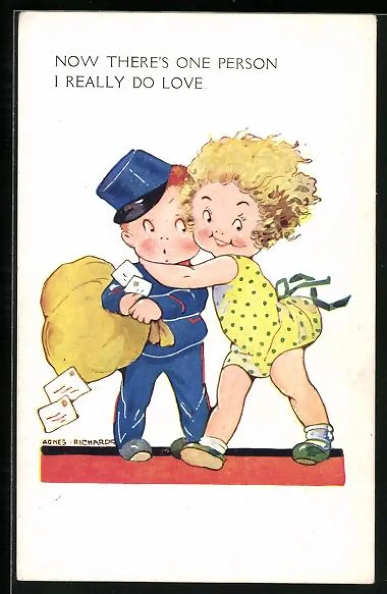 Künstler-AK Agnes Richardson: Now there`s one person I really do love, Mädchen umarmt Briefträger