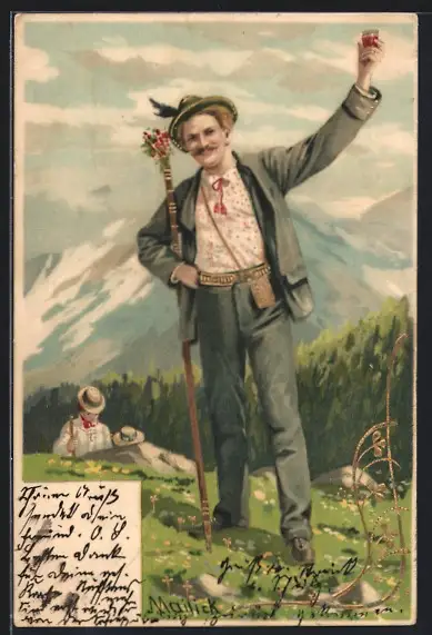Künstler-AK Alfred Mailick: Ein Wanderer hebt das Glas zum Pfingstgrusse