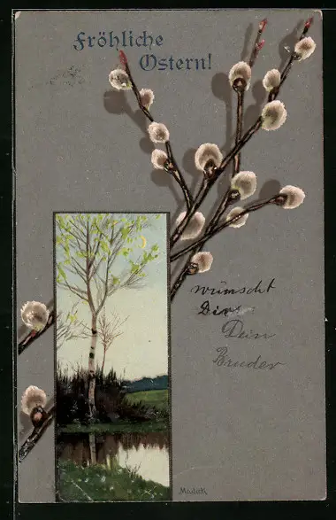 Künstler-AK Alfred Mailick: Fröhliche Ostern, Palmkätzchenzweige