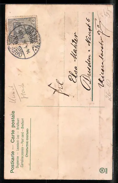 alte Ansichtskarte, gelaufen, Bugspur unten mittig mit Einriss, guter Zustand