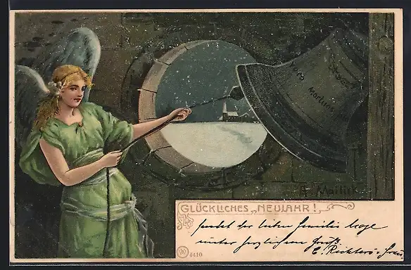 Künstler-AK Alfred Mailick: Glückliches Neujahr! Neujahrsengel läutet die Glocke