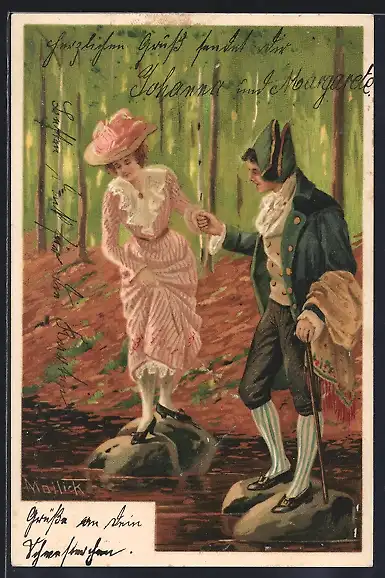 Künstler-AK Alfred Mailick: Herr hilft der Dame über den Bach