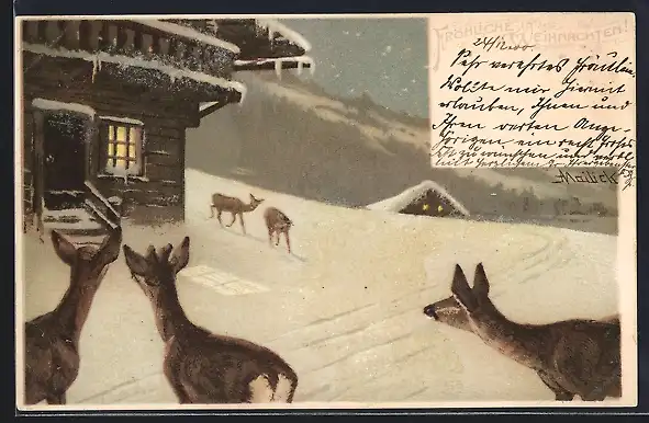 Künstler-AK Alfred Mailick: Hungriges Rotwild umschleicht ein verschneites Haus