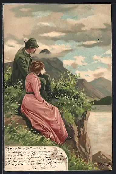 Künstler-AK Alfred Mailick: Junge Frau mit Mann schauen von einer Anhöhe auf einen See
