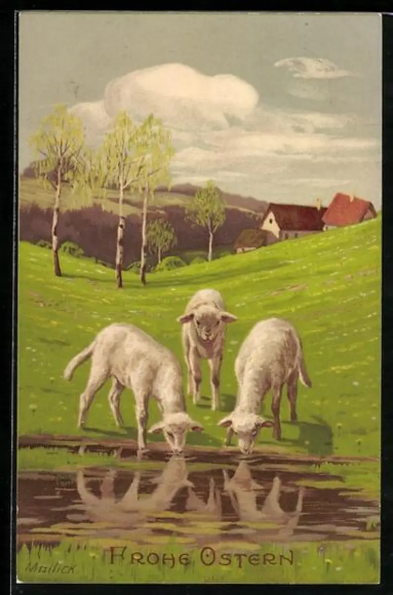 Künstler-AK Alfred Mailick: Landschaft mit drei Lämmern am Teich