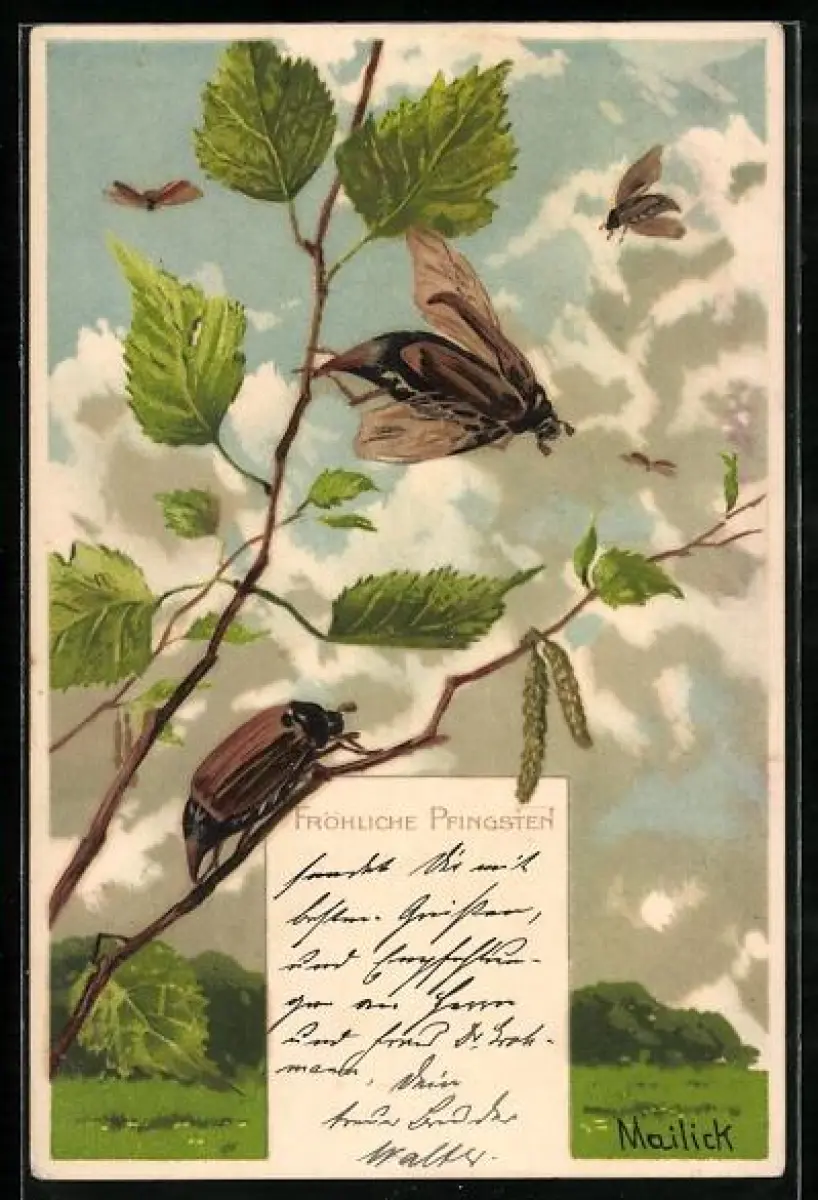 Künstler-AK Alfred Mailick: Maikäfer an Zweigen, Pfingstgruss