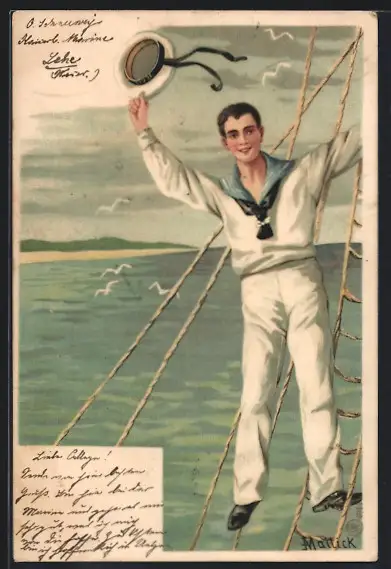 Künstler-AK Alfred Mailick: Matrose hängt grüssend in der Takelage eines Segelschiffes