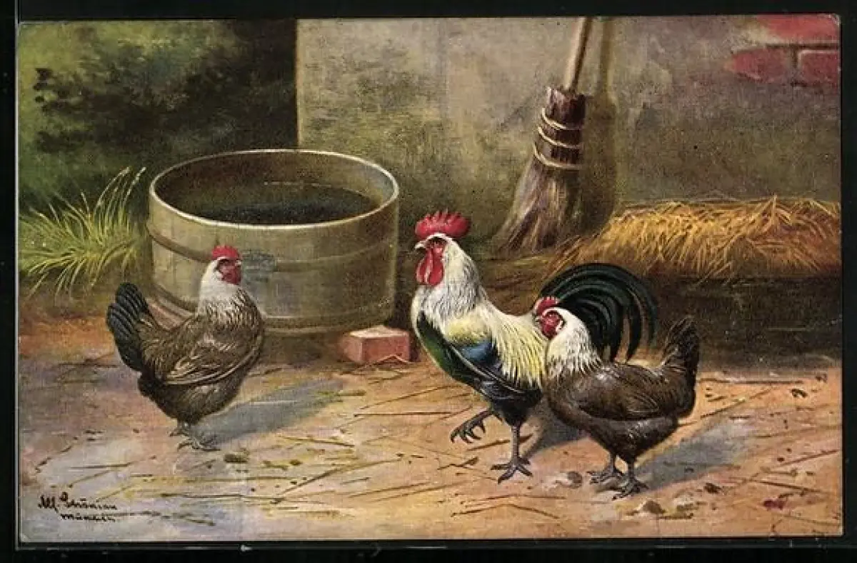 Künstler-AK Alfred Schönian: Hahn und Hühner beim Haus