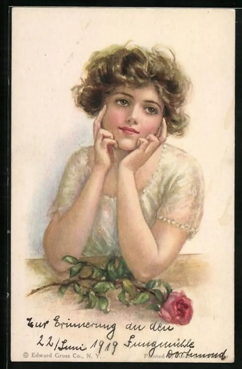 Künstler-AK Alice Luella Fidler: Junge Frau mit nachdenklichem Blick und Rose