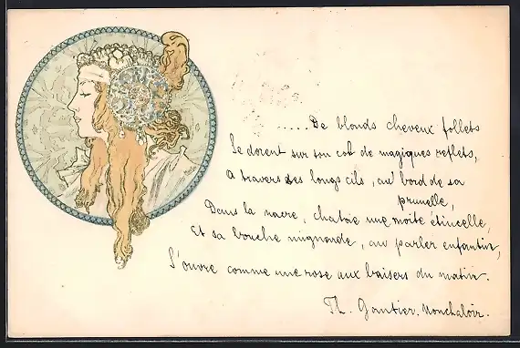 Künstler-AK Alphonse Mucha: Frauenprofil mit blondem Haar und blauem Kopfschmuck, Jugendstil