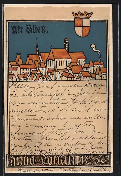 Künstler-AK Alt-Wien, Stadt-Panorama anno domini 1630, Wappen