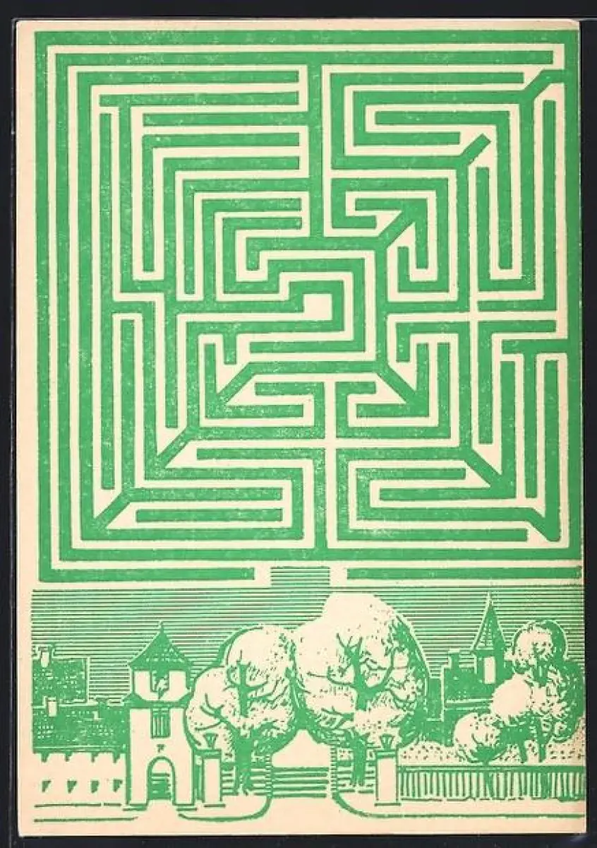 Künstler-AK Altjessnitz, Teilansicht des Ortes und Draufsicht des Irrgartens