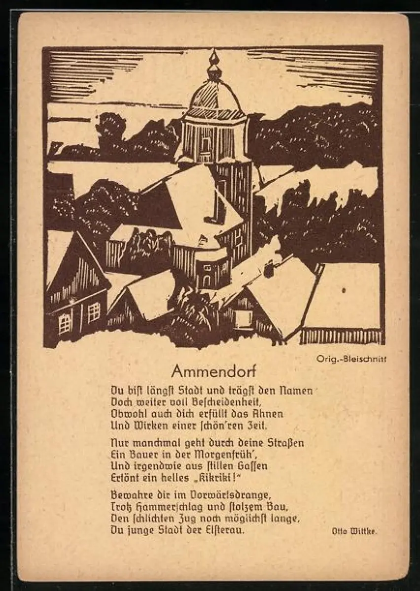 Künstler-AK Ammendorf, Teilansicht mit Kirche, Bleischnitt