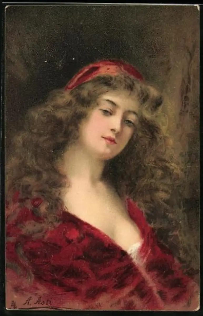 Künstler-AK Angelo Asti: Frau mit wallendem Haar in rubinroter Robe