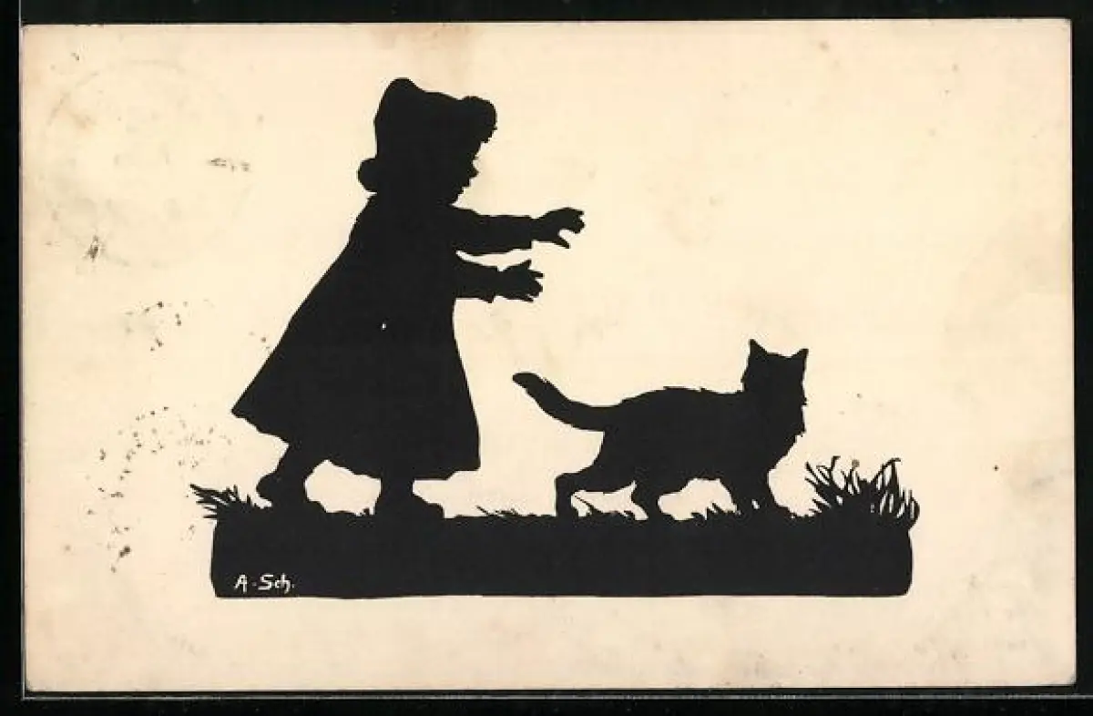 Künstler-AK Anna Schirmer: Kind und Katze, Silhouette