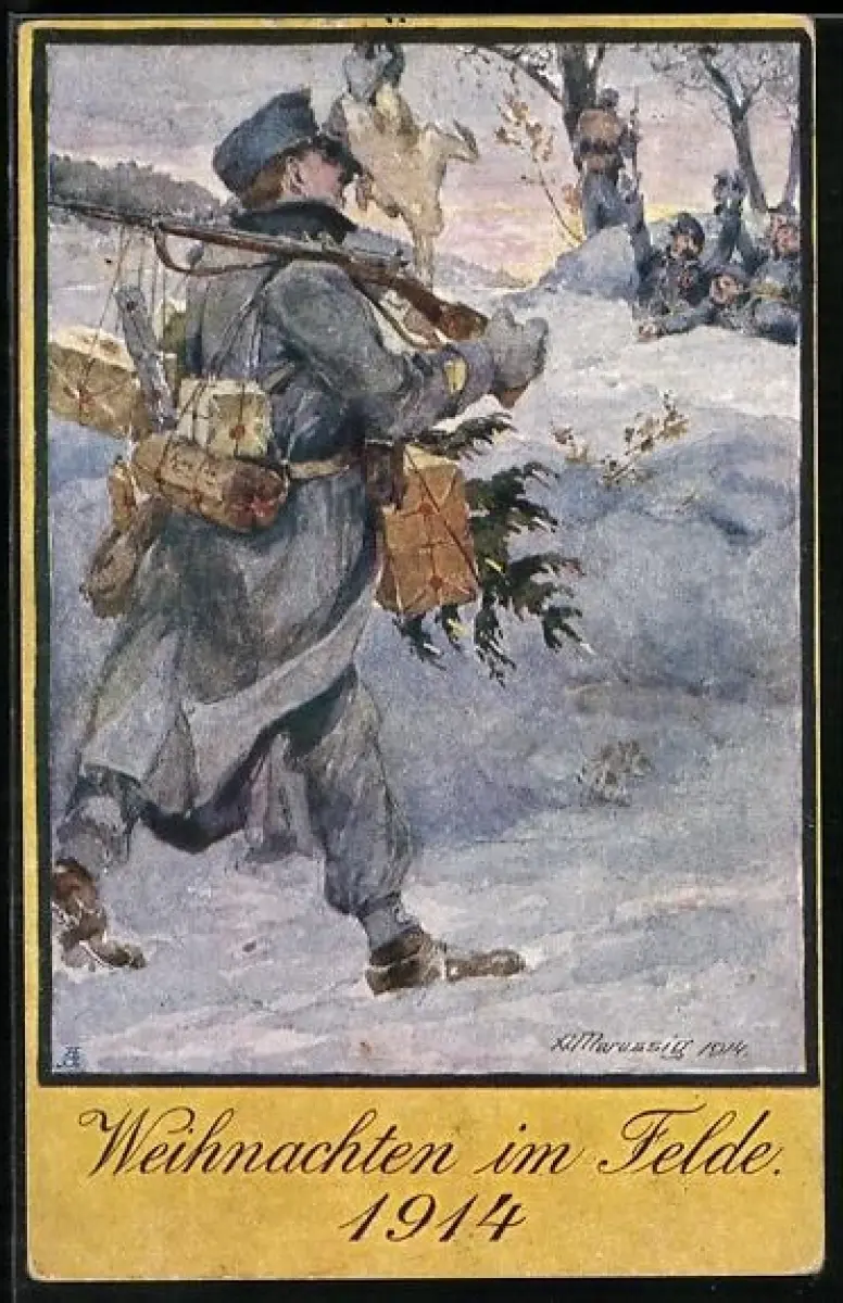 Künstler-AK Anton Marussig: Weihnachten im Felde 1914, Soldat mit Paketen