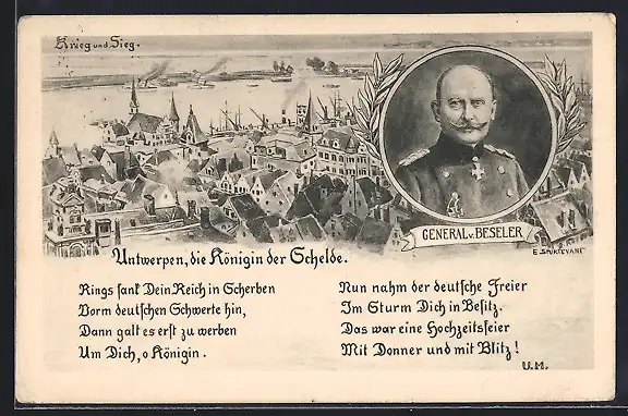 Künstler-AK Antwerpen, Ortsansicht mit General v. Beseler in Uniform