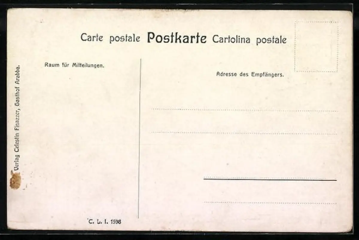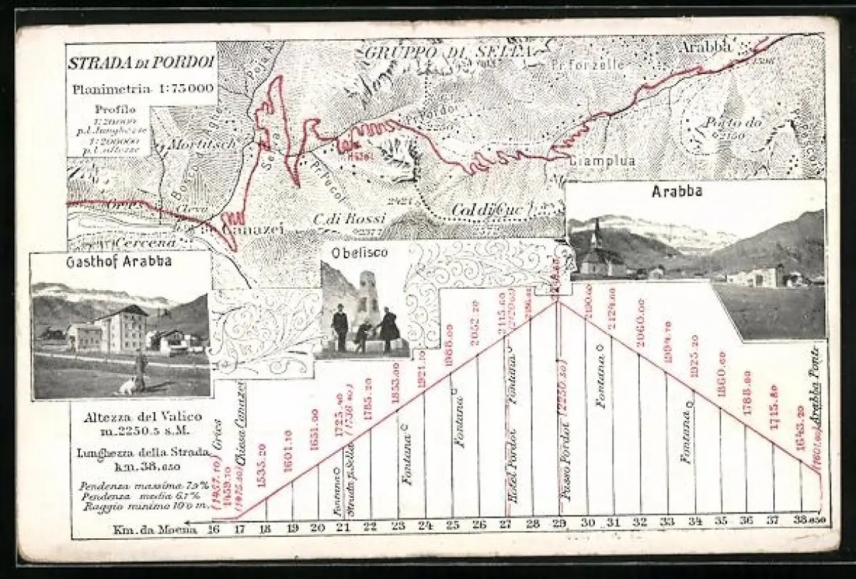 Künstler-AK Arabba, Gasthof, Obelisco, Teilansicht, Landkarte mit Mortitsch, Canazei und Cercena