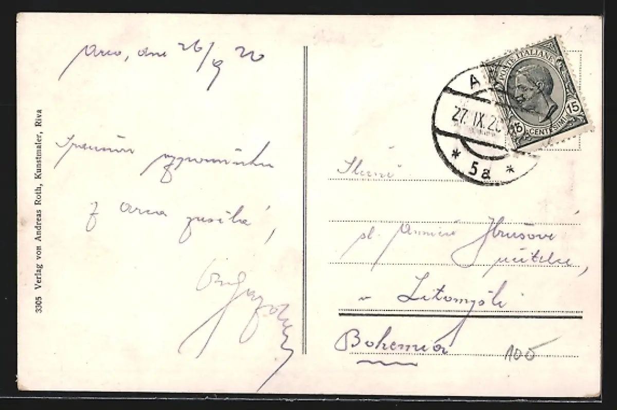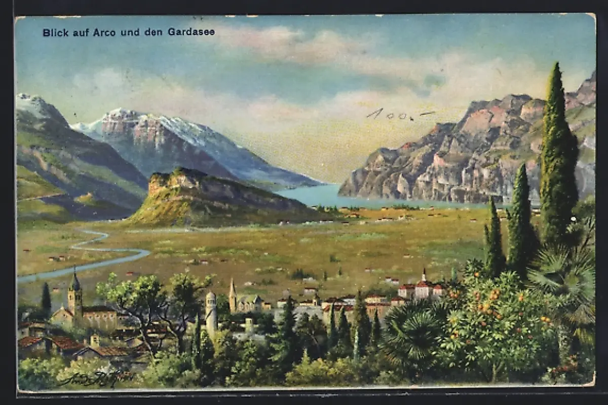 Künstler-AK Arco, Ortsansicht mit Gardasee u. Umgebung