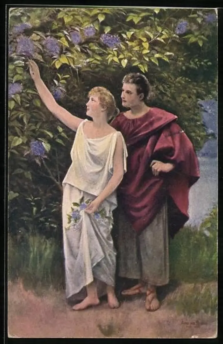 Künstler-AK Arno von Riesen: Einst im Mai, Paar vor einem Fliederstrauch