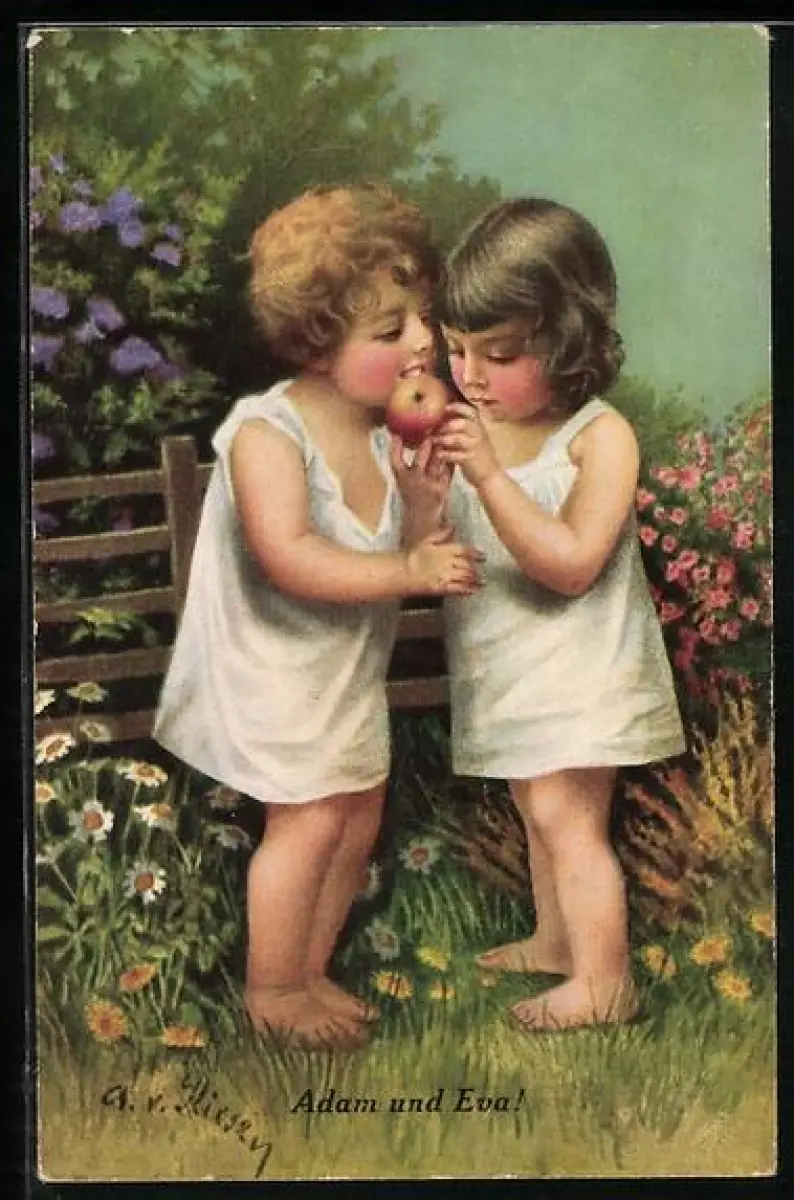 Künstler-AK Arno von Riesen: Kinder teilen sich einen Apfel, Adam und Eva!