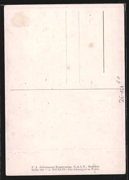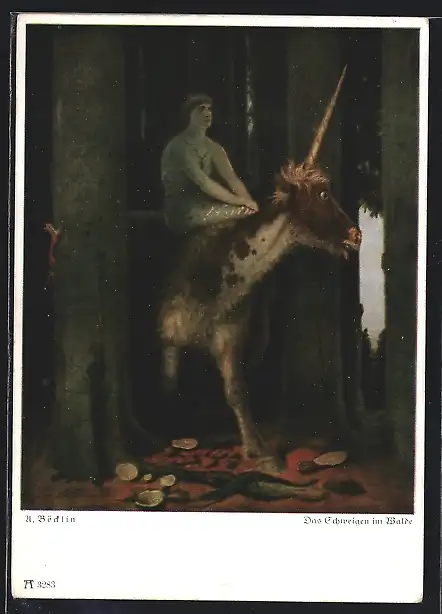 Künstler-AK Arnold Böcklin: Das Schweigen im Walde, eine Frau reitet auf einem Einhorn durch den Wald