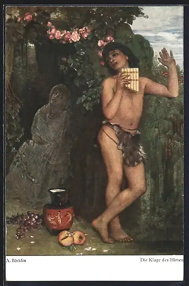 Künstler-AK Arnold Böcklin: Die klage des Hirten, junger Mann spielt auf der Panflöte
