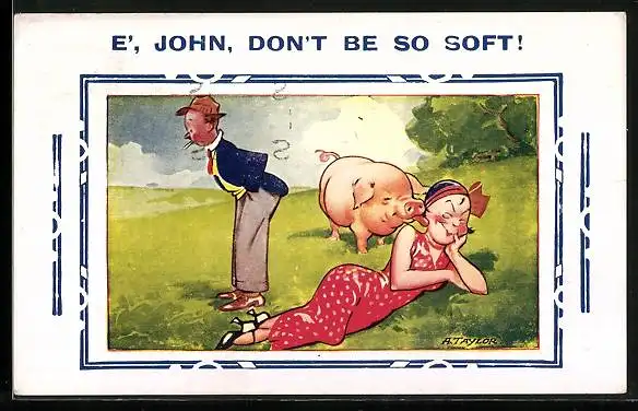 Künstler-AK Arnold Taylor: Frau liegt auf einer Wiese, Schwein schleckt ihre Wange, E, John, dont be so soft