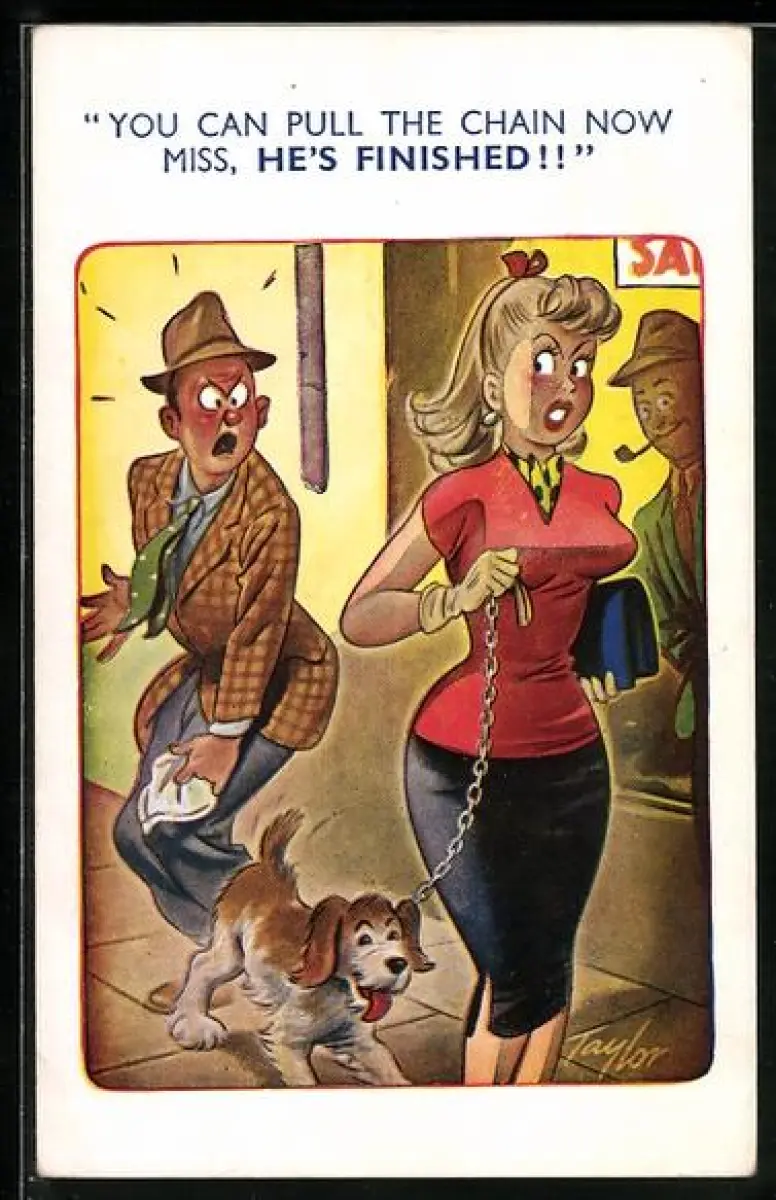 Künstler-AK Arnold Taylor: Hund pinkelt einem Mann ans Bein