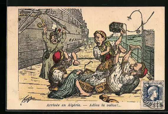 Künstler-AK Arrivée en Algérie, Frau wird der Koffer gestohlen
