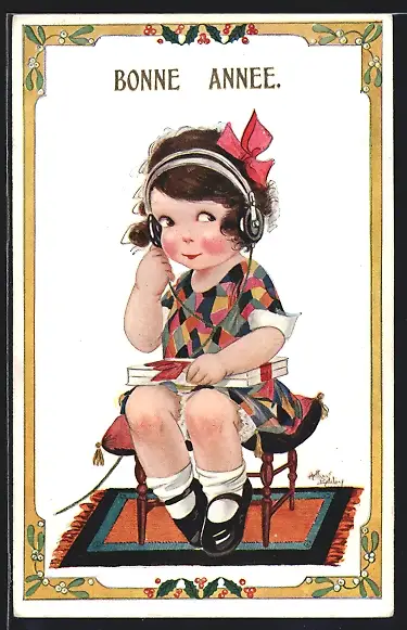 Künstler-AK Arthur Butcher: Mädchen mit Kopfhörern, Neujahrsgruss