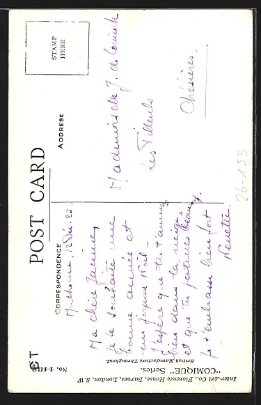 Personenbezogene Daten auf der Rückseite der Karte wurden durch blauen Textmarker unkenntlich gemacht. Die blauen Stellen sind auf die Vorderseite durchgeweicht und wirken sich negativ auf das Postkartenfoto aus