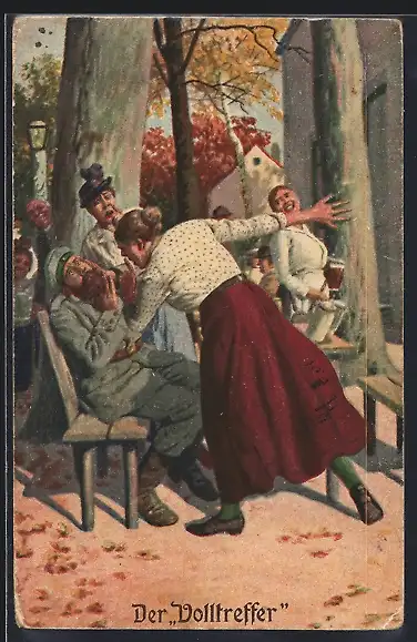 Künstler-AK Arthur Thiele: Der Volltreffer, Mädchen hat Soldat eine Backpfeife verpasst
