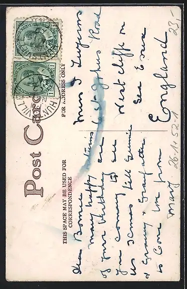 Personenbezogene Daten auf der Rückseite der Karte wurden durch blauen Textmarker unkenntlich gemacht. Die blauen Stellen sind auf die Vorderseite durchgeweicht und wirken sich negativ auf das Postkartenfoto aus