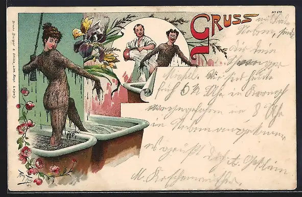 Künstler-AK Arthur Thiele: Frau steigt vom Schlammbad ins normale hinüber, Mann wird gewaschen, Badekultur