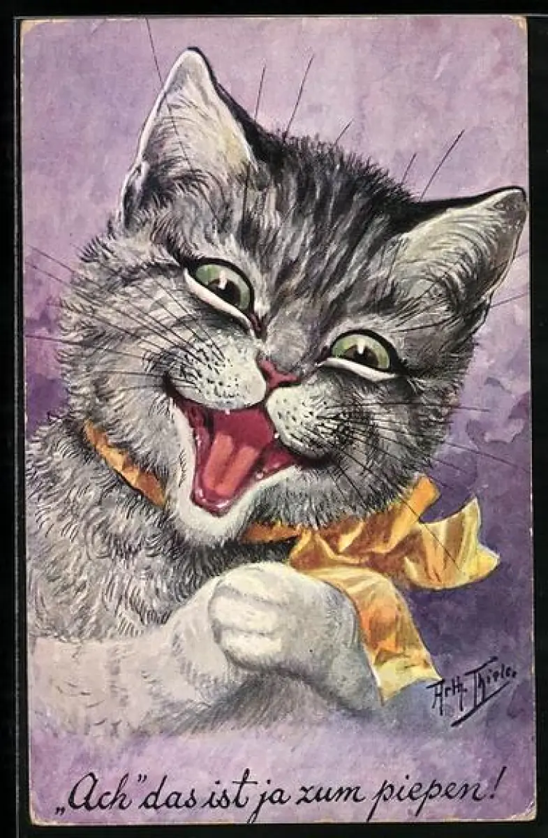 Künstler-AK Arthur Thiele: Katze mit gelber Schleife freut sich