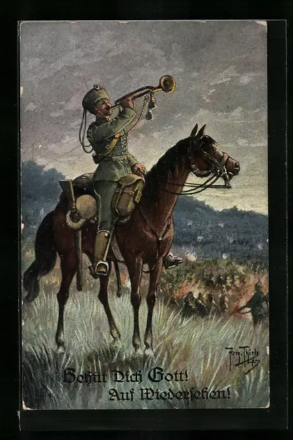 Künstler-AK Arthur Thiele: Postreiter mit Trompete zu Pferd