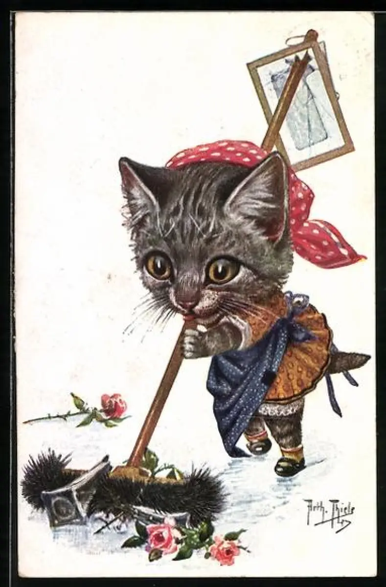Künstler-AK Arthur Thiele: Vermenschlichtes Kätzchen macht sauber