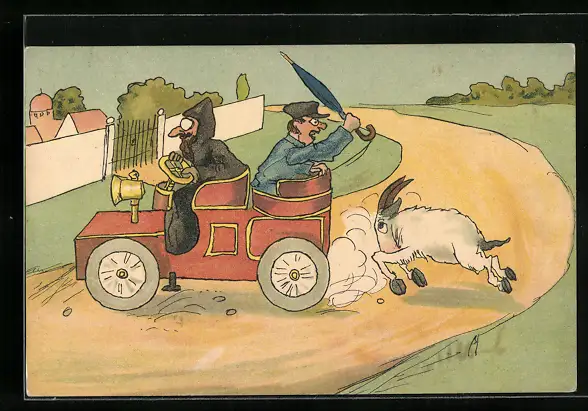 Künstler-AK Auto wird von einem wilden Ziegenbock verfolgt