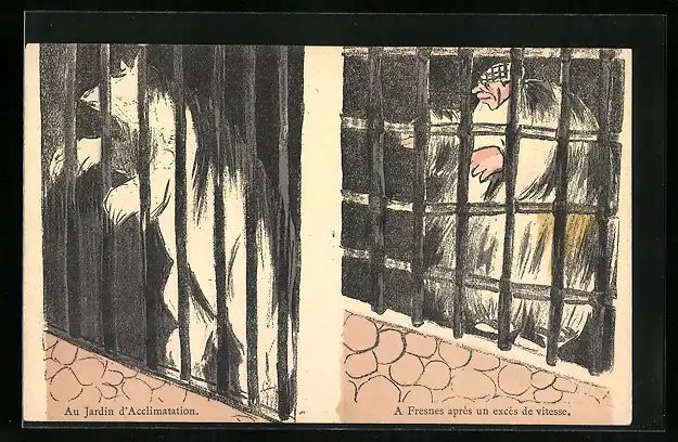 Künstler-AK Autofahrer im Jardin d`Acclimatation in dickem Mantel gleicht einem Bären