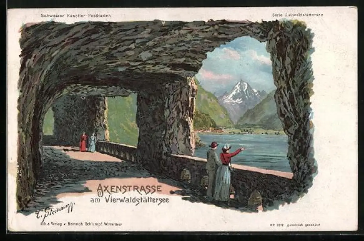 Künstler-AK Axenstrasse, Passanten auf der Axenstrasse am Vierwaldstättersee um 1900