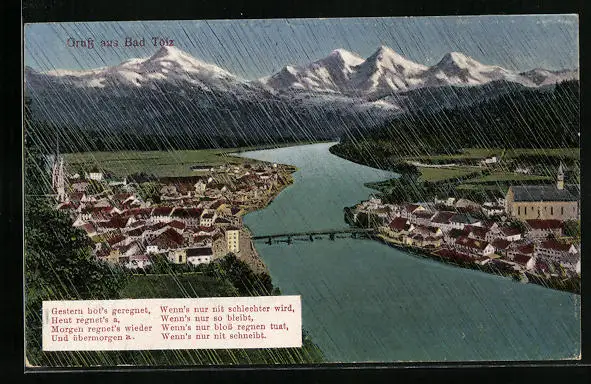Künstler-AK Bad Tölz, Verregnete Totalansicht mit Isar
