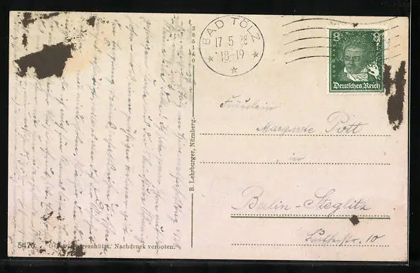 alte Ansichtskarte, gelaufen 1928, rückseitig Klebe- und Papierreste, guter Zustand