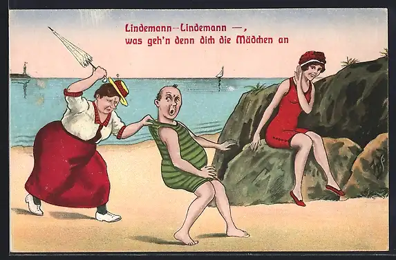 Künstler-AK Bansin, Lindemann was geh`n dich die Mädchen an, Bademode