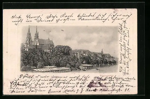Künstler-AK Basel, Ortsansicht mit Rheinpartie