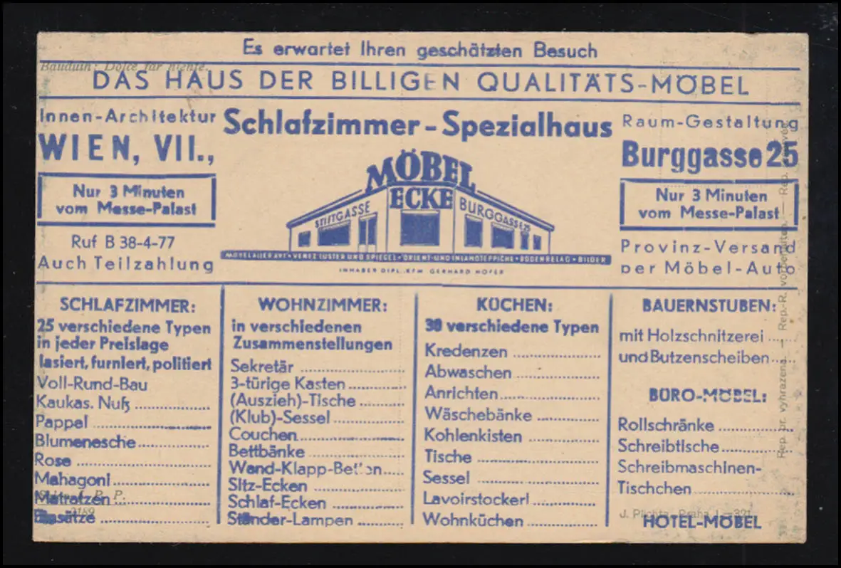 komplette Rückseite / Anschriftenseite mit Werbung DAS HAUS DER BILLIGEN QUALITÄTS-MÖBEL "Schlafzimmer-Spezialhaus" in Wien