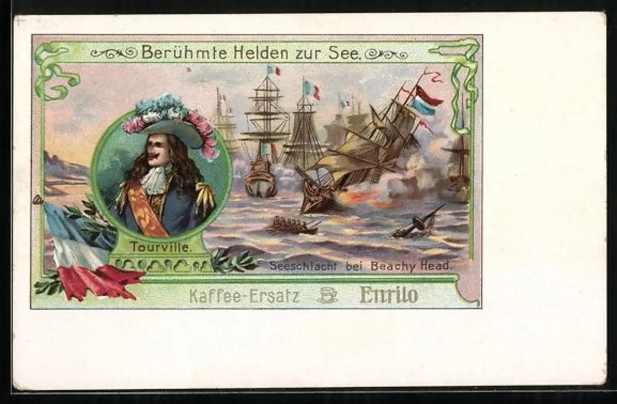 Künstler-AK Beachy Head, Schiffe in der Seeschlacht bei Beachy Head, Tourville, Reklame für Kaffee-Ersatz Enrilo